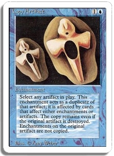 Select any artifact in play. This enchantment acts as a duplicate of that artifact; it is affected by cards that affect either enchantments or artifacts. The copy remains even if the original artifact is destroyed. Enchantments on the original artifact are not copied.
