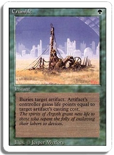 Buries target artifact. Artifact's controller gains life points equal to target artifact's casting cost.