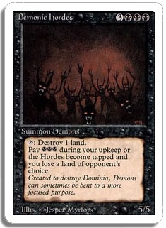 <T>: Destroy 1 land. Pay <BBB> during your upkeep or the Hordes become tapped and you lose a land of opponent's choice.