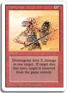 Disintegrate does X damage to one target. If target dies this turn, target is removed from the game entirely.