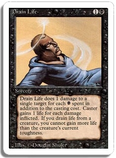 Drain Life does 1 damage to a single target for each <B> spent in addition to the casting cost. Caster gains 1 life for each damage inflicted. If you drain life from a creature, you cannot gain more life than the creature's current toughness.