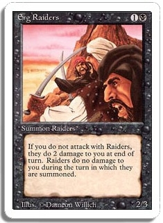 If you do not attack with Raiders, they do 2 damage to you at end of turn. Raiders do no damage to you during the turn in which they are summoned.