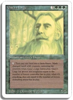 TAP: Turn any one land into a basic forest. Mark nged lands with counters, removing the counters n Gaea's Liege leaves play. Gaea's Liege has er and toughness equal to the number of forests troller has in play; when it's attacking, they are al to the number of forests defending player has play.