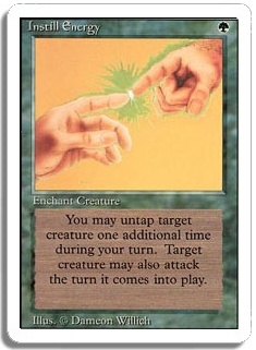 You may untap target creature one additional time during your turn. Target creature may also attack the turn it comes into play.