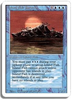 You must pay <UUU> during your upkeep phase to untap Island Fish. Island Fish cannot attack unless opponent has islands in play. Island Fish is destroyed immediately if at any time you have no islands in play.