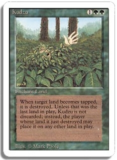 When target land becomes tapped, it is destroyed. Unless that was the last land in play, Kudzu is not discarded; instead the player whose land it just destroyed may place it on any other land in play.