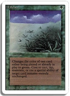 Changes the color of one card either being played or already in play to green. Cost to cast, tap, maintain, or use a special ability of target card remains entirely unchanged.