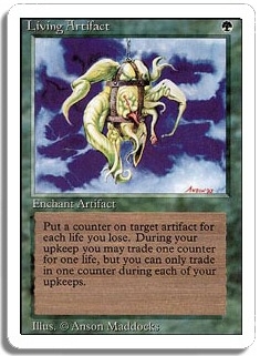 Put a counter on target artifact for each life you lose. During your upkeep you may trade one counter for one life, but you can only trade in one counter during each of your upkeeps.