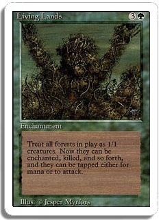 Treat all forests in play as 1/1 creatures. Now they can be enchanted, killed, and so forth, and they can be tapped either for mana or to attack.