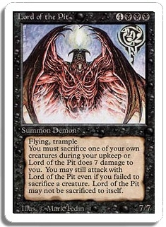 Flying, Trample. You must sacrifice one of your own creatures during your upkeep or Lord of the Pit does 7 damage to you. You may still attack with Lord of the Pit even if you failed to sacrifice a creature. Lord of the Pit may not be sacrificed to itself.