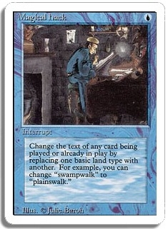 Change the text of any card being played or already in play by replacing one basic land type with another. For example, you can change "swampwalk" to "plainswalk".