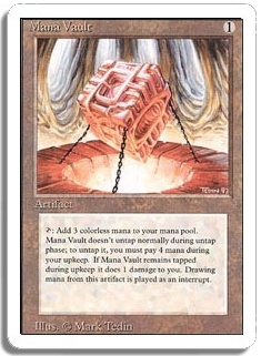 <T>: Add 3 colorless mana to your mana pool. Mana Vault doesn't untap normally during untap phase; to untap it, you must pay 4 mana during your upkeep. If Mana Vault remains tapped during upkeep it does 1 damage to you. Drawing mana from this artifact is played as an interrupt.