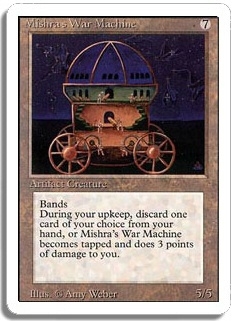 Bands. During your upkeep, discard one card of your choice from your hand, or Mishra's War Machine becomes tapped and does 3 points of damage to you.