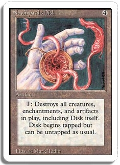 <1>: Destroys all creatures, enchantments, and artifacts in play, including Disk itself. Disk begins tapped but can be untapped as usual.