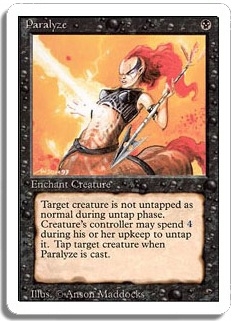 Target creature is not untapped as normal during untap phase. Creature's controller may spend <4> during his or her upkeep to untap it. Tap target creature when Paralyze is cast.