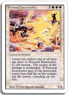 Caster can redirect any or all damage done to Personal Incarnation to self instead. The source of the damage is unchanged. If Personal Incarnation goes to the graveyard, caster loses half his or her remaining life points, rounding up the loss.