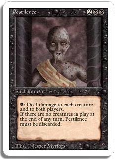 <B>: Do 1 damage to each creature and to both players. If there are no creatures in play at the end of any turn, Pestilence must be discarded.