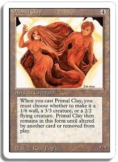 When you cast Primal Clay, you must choose whether to make it a 1/6 wall, a 3/3 creature, or a 2/2 flying creature. Primal Clay then remains in this form until altered by another card or removed from play.