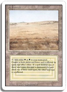 <T>: Add either <W> or <G> to your mana pool. Counts as both plains and forest and is affected by spells that affect either. If a spell destroys one of these land types, this card is destroyed; if a spell alters one of these land types, the other land type is unaffected.