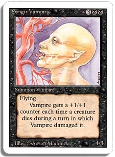 Flying. Vampire gets a +1/+1 counter each time a creature dies during a turn in which Vampire damaged it.
