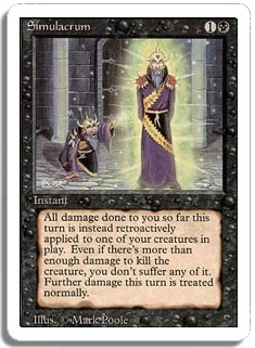 All damage done to you so far this turn is instead retroactively applied to one of your creatures in play. Even if there's more than enough damage to kill the creature, you don't suffer any of it. Further damage this turn is treated normally.