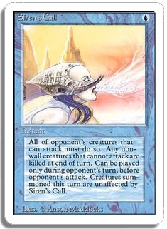 All of opponent's creatures that can attack must do so. Any non-wall creatures that cannot attack are killed at end of turn. Can be played only during opponent's turn, before opponent's attack. Creatures summoned this turn are unaffected by Siren's Call.