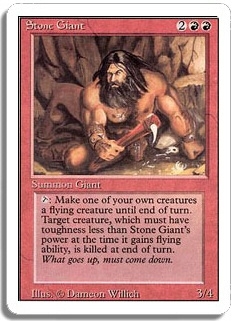 <T>: Make one of your own creatures a flying creature until end of turn. Target creature, which must have toughness less than Stone Giant's power at the time it gains flying ability, is killed at end of turn.