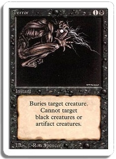 Buries target creature. Cannot target black creatures or artifact creatures.