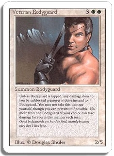 Unless Bodyguard is tapped, any damage done to you by unblocked creatures is done instead to Bodyguard. You may not take this damage yourself, though you can prevent it if possible. No more than one Bodyguard of your choice can take damage for you in this manner each turn.