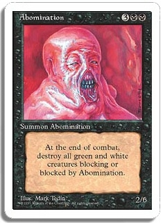 At the end of combat, destroy all green and white creatures blocking or blocked by Abomination.