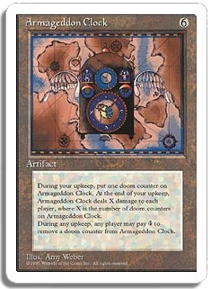 During your upkeep, put one doom counter on Armageddon Clock At the end of your upkeep, Armageddon Clock deals X damage to each player, where X is the number of doom counters on Armageddon Clock. During any upkeep, any player may pay <4> to remove a doom counter from Armageddon Clock.