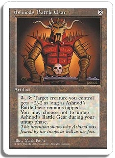 <2,T>: Target creature you control gets +2/-2 as long as Ashnod's Battle Gear remains tapped. You may choose not to untap Ashnod's Battle Gear during your untap phase.