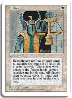 Each player sacrifices enough lands to equalize the number of lands all players control. The player who controls the fewest lands cannot sacrifice any in this way. All players then equalize cards in hand and then creatures in play the same way.