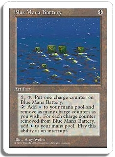 <2,T>: Put one charge counter on Blue Mana Battery. <T>: Add <U> to your mana pool and remove as many charge counters as you wish. For each charge counter removed from Blue Mana Battery, add <U> to your mana pool. Play this ability as an interrupt.
