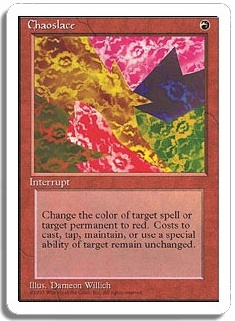 Change the color of target spell or target permanent to red. Costs to cast, tap, maintain, or use a special ability of target remain unchanged.