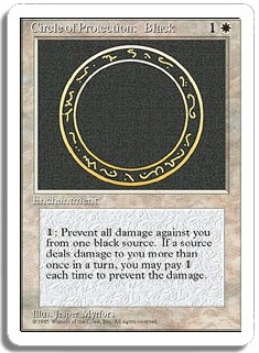<1>: Prevent all damage against you from one black source. If a source deals damage to you more than once in a turn, you may pay <1> each time to prevent the damage.