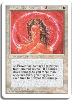 <1>: Prevent all damage against you from one red source. If a source deals damage to you more than once in a turn, you may pay <1> each time to prevent the damage.
