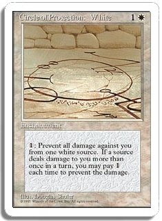 <1>: Prevent all damage against you from one white source. If a source deals damage to you more than once in a turn, you may pay <1> each time to prevent the damage.
