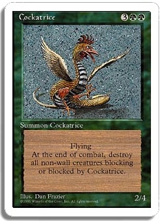 Flying. At the end of combat, destroy all non-wall creatures blocking or blocked by Cockatrice.