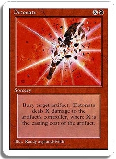 Bury target artifact. Detonate deals X damage to the artifact's controller, where X is the casting cost of the artifact.