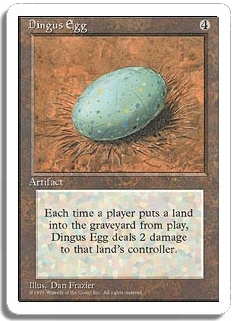 Each time a player puts a land into the graveyard from play, Dingus Egg deals 2 damage to that land's controller.