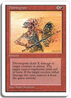 Disintegrate deals X damage to target creature or player. The target cannot regenerate until end of turn. If the target receives lethal damage this turn, remove it from the game entirely.