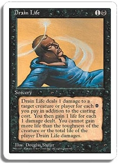 Drain Life deals 1 damage to a target creature or player for each <B> you pay in addition to the casting cost. You then gain 1 life for each 1 damage dealt. You cannot gain more life than the toughness of the creature or the total life of the player Drain Life damages.