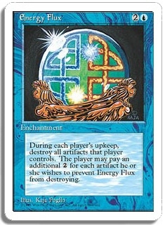 During each player's upkeep, destroy all artifacts that player controls. The player may pay an additional <2> for each artifact he or she wishes to prevent Energy Flux from destroying.