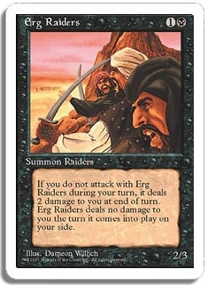 If you do not attack with Erg Raiders during your turn, it deals 2 damage to you at end of turn. Erg Raiders deals no damage to you the turn it comes into play on your side.