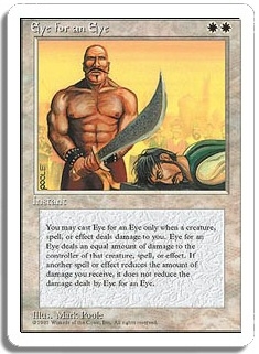 You may cast Eye for an Eye only when a creature, spell, or effect deals damage to you. Eye for an Eye deals an equal amount of damage to the controller of that creature, spell, or effect. If another spell or effect reduces the amount of damage you receive, it does not reduce the damage dealt by Eye for an Eye.