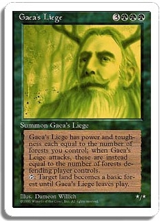 Gaea's Liege has power and toughness each equal to the ber of forests you control; when Gaea's Leige attacks, se are instead equal to the number of forests defending yer controls. : Target land becomes a basic forest until Gaea's Liege ves play.