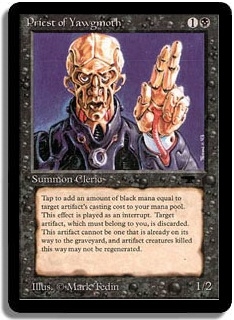 Tap to add an amount of black mana equal to target artifact's casting cost to your mana pool. This effect is played as an interrupt. Target artifact, which must belong to you, is discarded. This artifact cannot be one that is already on its way to the graveyard, and artifact creatures killed this way may not be regenerated.