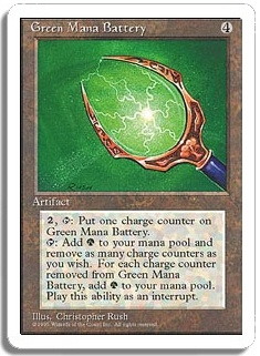 <2,T>: Put one charge counter on Green Mana Battery. <T>: Add <G> to your mana pool and remove as many charge counters as you wish. For each charge counter removed from Green Mana Battery, add <G> to your mana pool. Play this ability as an interrupt.