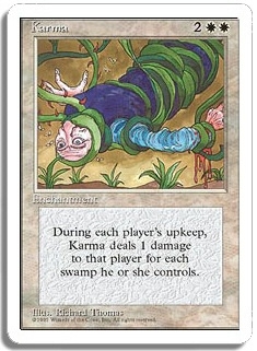 During each player's upkeep, Karma deals 1 damage to that player for each swamp he or she controls.